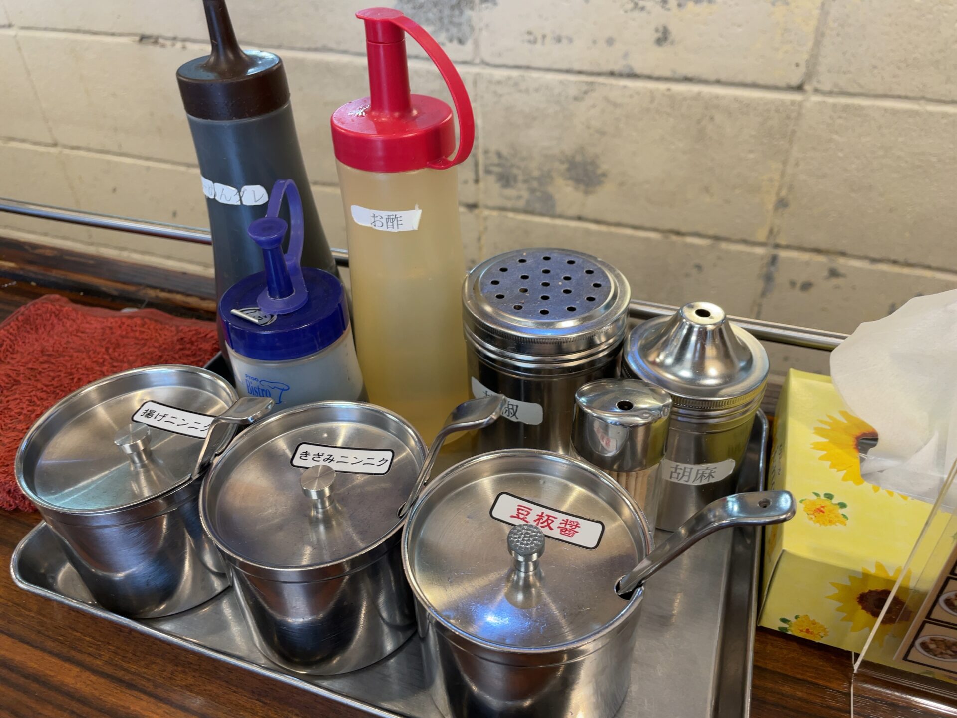 卓上には、揚げニンニク、きざみニンニク、お酢にラー油、豆板醤など味変アイテムが充実。ラーメンを育てるのは自分次第、という気概を感じます。
